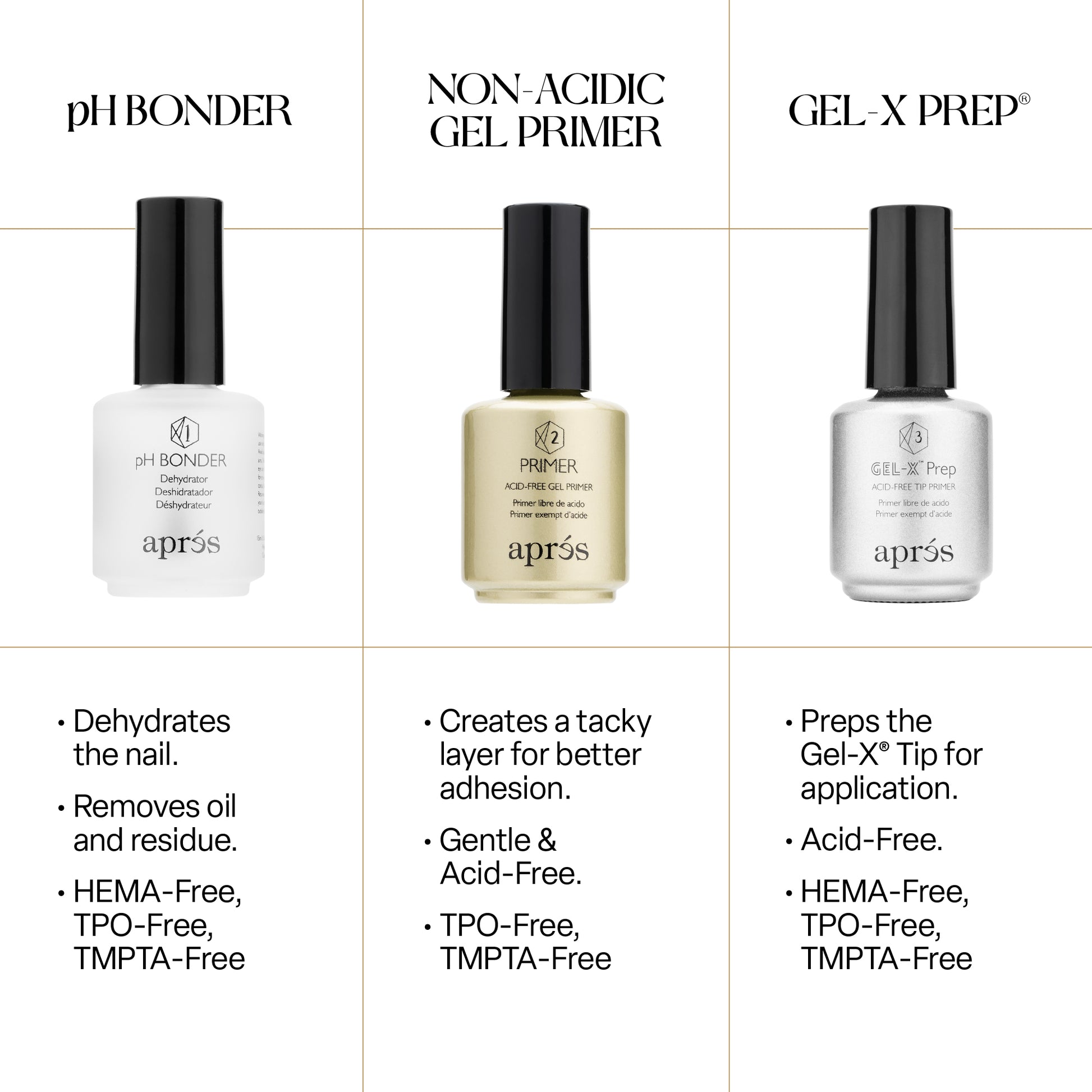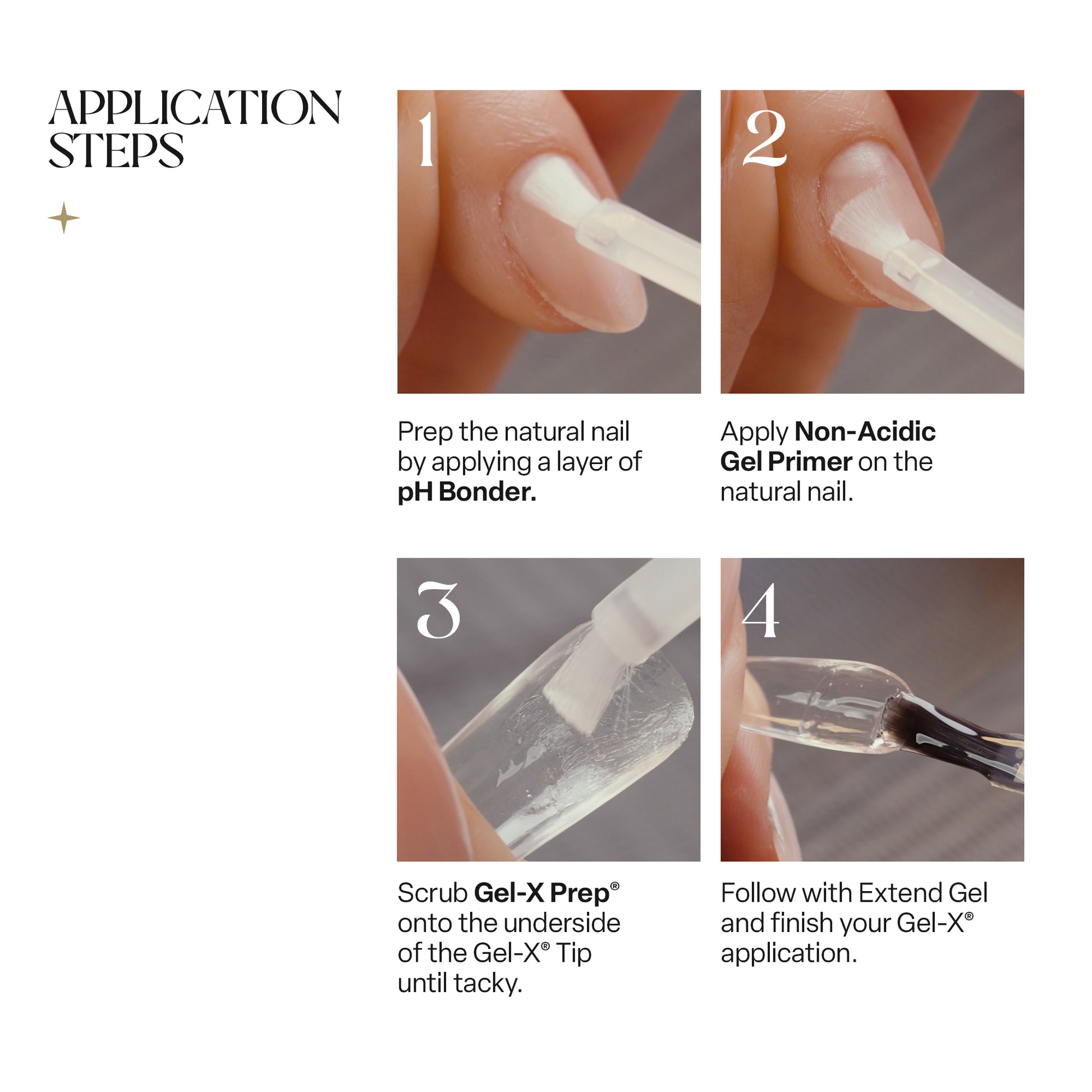 From nail plate to tip surface, every stage of prep is covered. pH Bonder removes oils and moisture. Non-Acidic Gel Primer creates a tacky bonding base. And Gel-X Prep® takes care of the tips—chemically etching the underside and gently texturizing the surface for flawless color application.