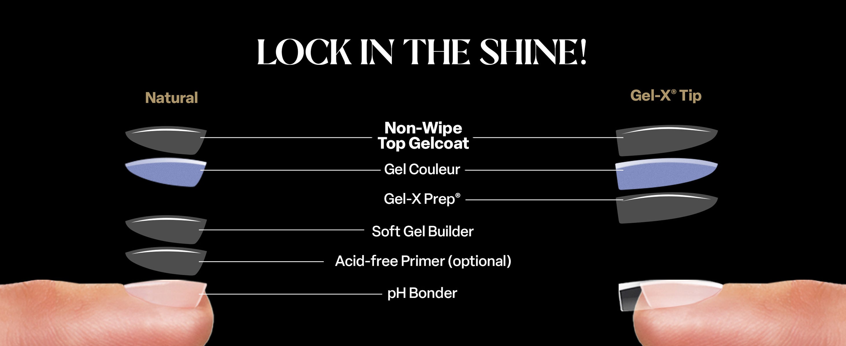 • After completing the final color or nail art layer, apply a thin, even coat of Non-Wipe Glossy Top Gelcoat.