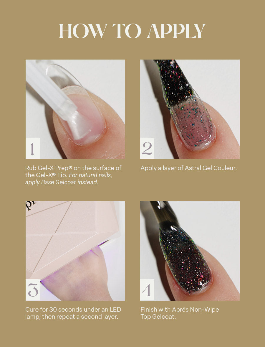 Astral Gel Couleur is a collection of 40 shades in 4 light-refracting, otherworldly finishes—Flash Glitter, Pearlescent, Velvet, and Shimmer Cat Eye. These streak-free, self-leveling formulas leave a unique energetic signature on the nail, empowering you to create looks that resonate on a spiritual level.