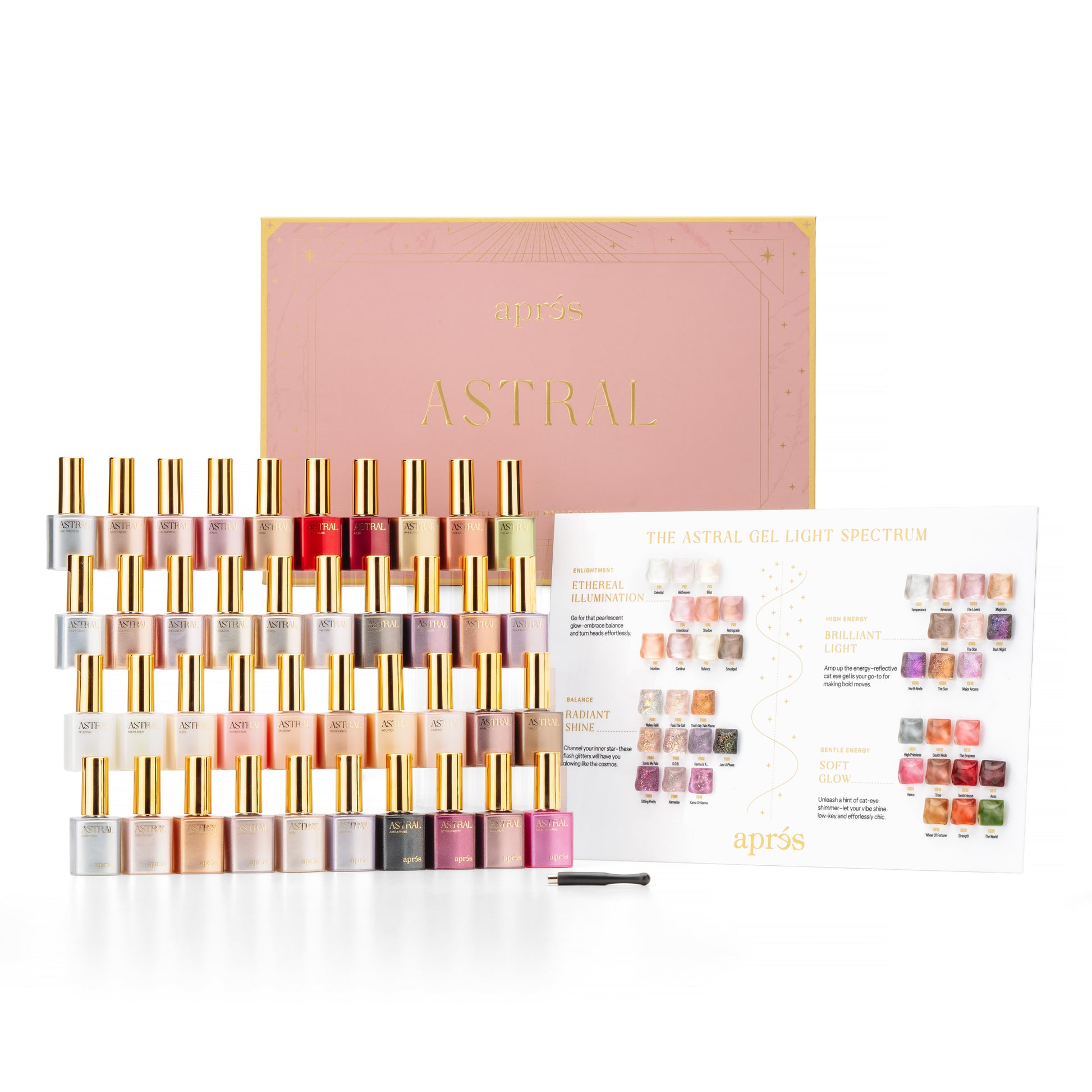Astral Gel Couleur is a collection of 40 shades in 4 light-refracting, otherworldly finishes—Flash Glitter, Pearlescent, Velvet, and Shimmer Cat Eye. These streak-free, self-leveling formulas leave a unique energetic signature on the nail, empowering you to create looks that resonate on a spiritual level.
