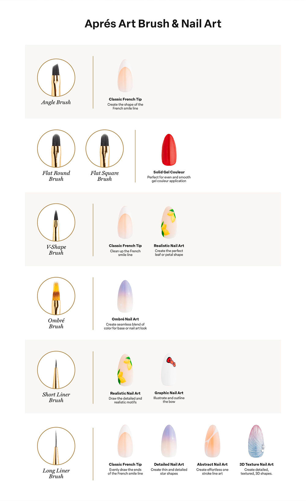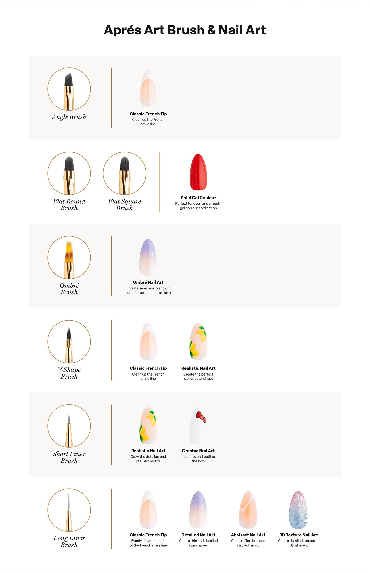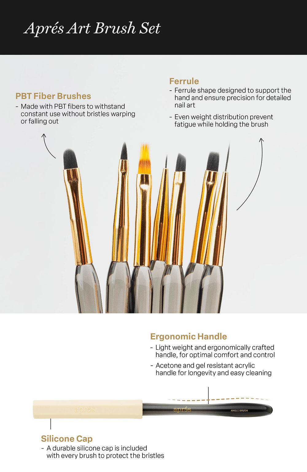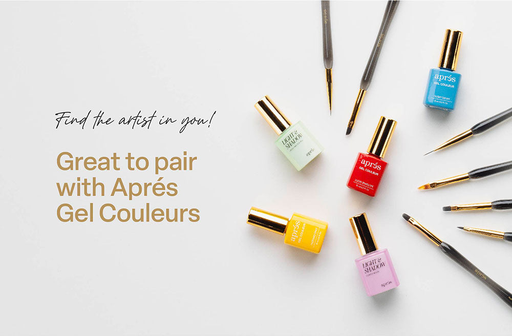 Aprés Art Brushes are versatile, high-quality tools that allow for easy application and creative nail art. Manufactured with PBT fibers, these brushes will be able to withstand constant and regular use without warping or falling out. Crafted with an ergonomic handle designed for optimal comfort and control, the Aprés Art Brush empowers you to achieve unparalleled accuracy. The ferrule perfectly balances the brush head, preventing fatigue and enhancing your artistic expression. A durable silicone cap is included with every brush, ensuring your brush is carefully encased and protected.