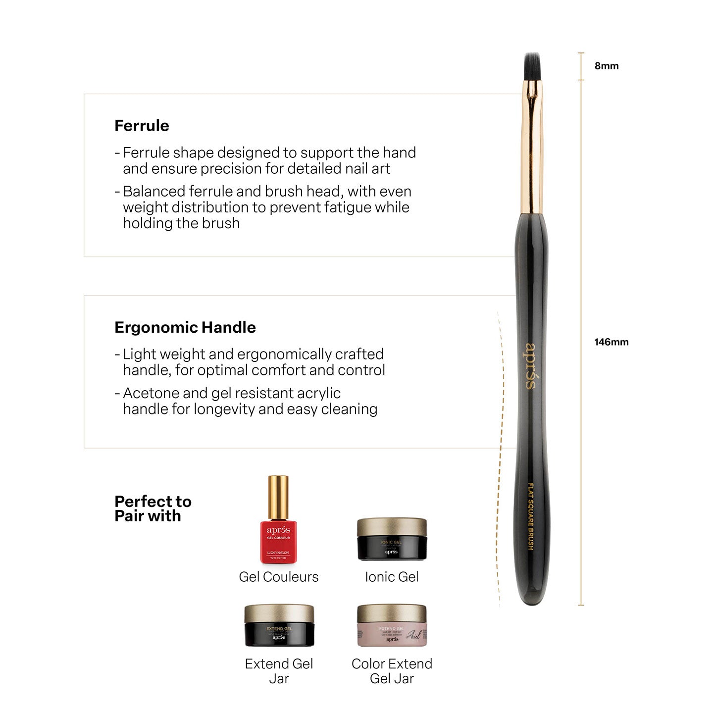 The Aprés Flat Square Brush provides precision control for smooth and even application coverage with its densely compacted bristles. With a long flat tip, the square-shaped brush will ensure a seamless application of base, builder, and gel color. The Aprés Flat Square Brush is an excellent alternative for those that prefer a broader brush over round brushes. Manufactured with PBT fibers, this brush will be able to withstand constant and regular use without warping or falling out.