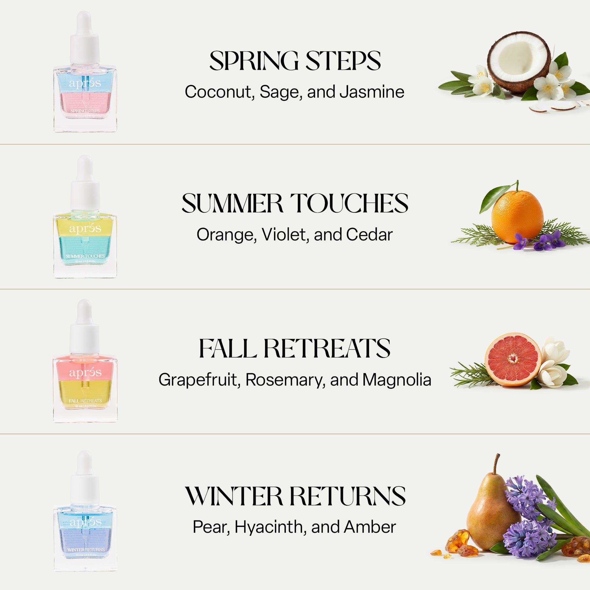 Elevate every manicure with the complete Aprés Cuticle Serum Collection. This curated set of four fast-absorbing, non-greasy cuticle serums transforms nail care into a spa-like ritual, combining nourishing skincare ingredients with refined, elegant fragrances.