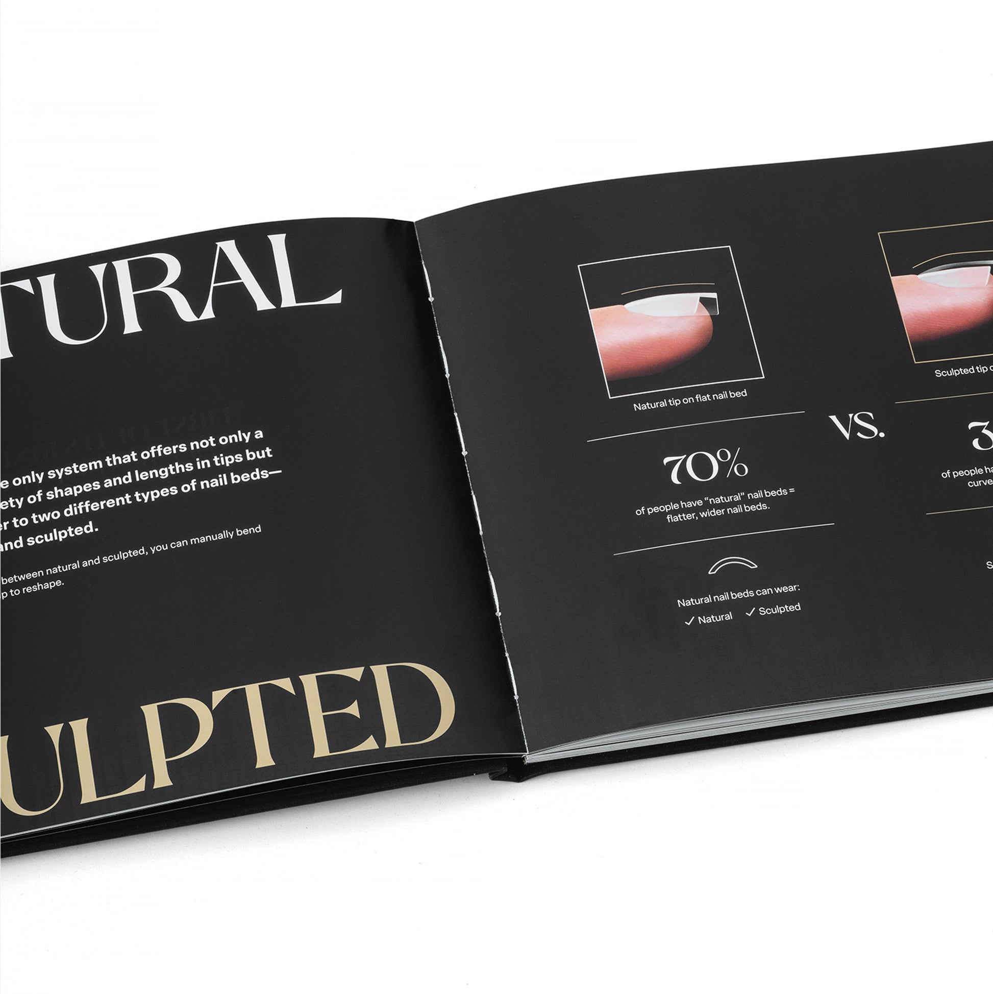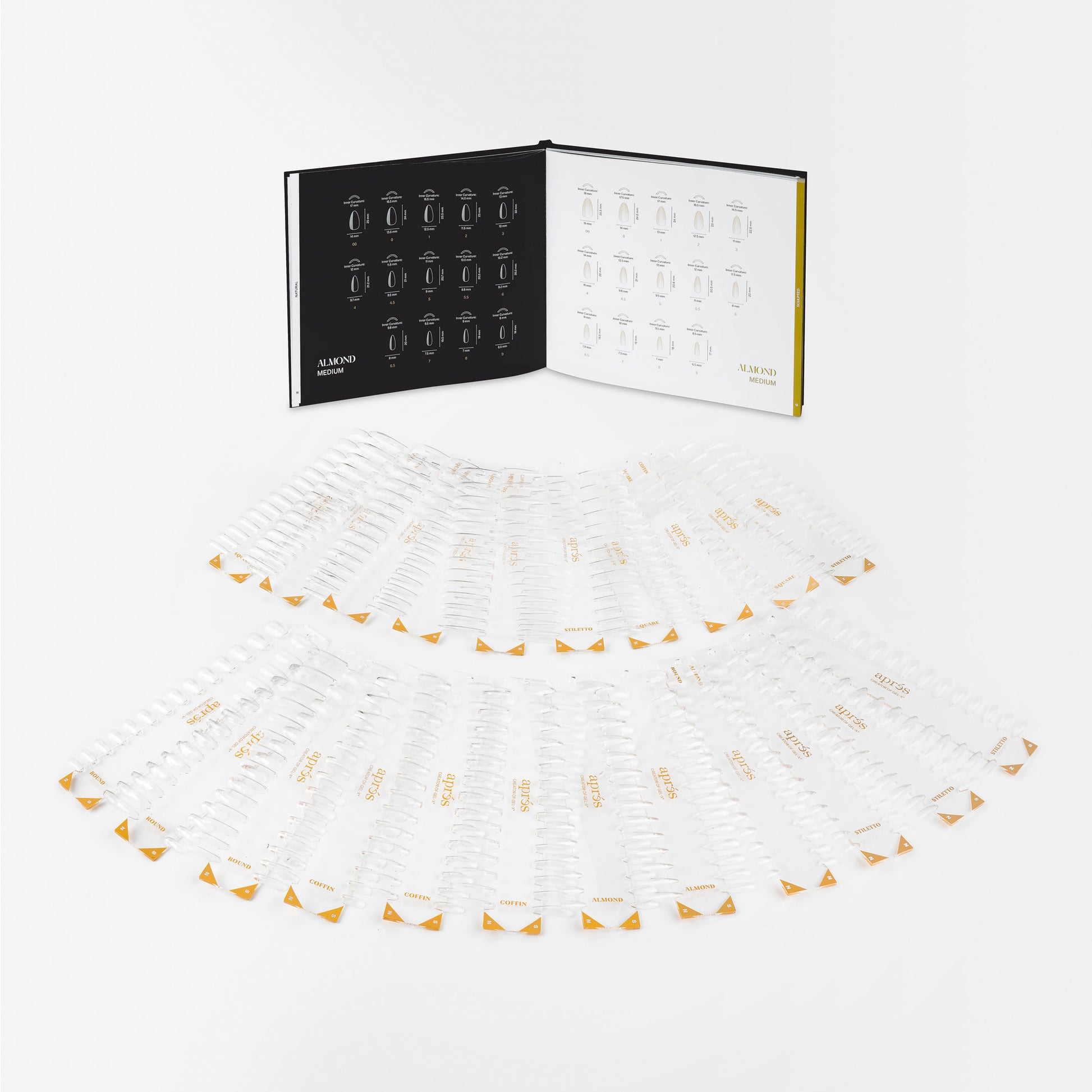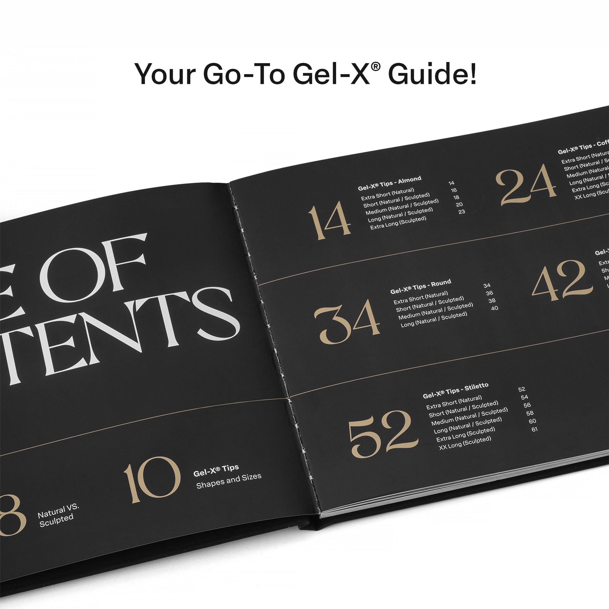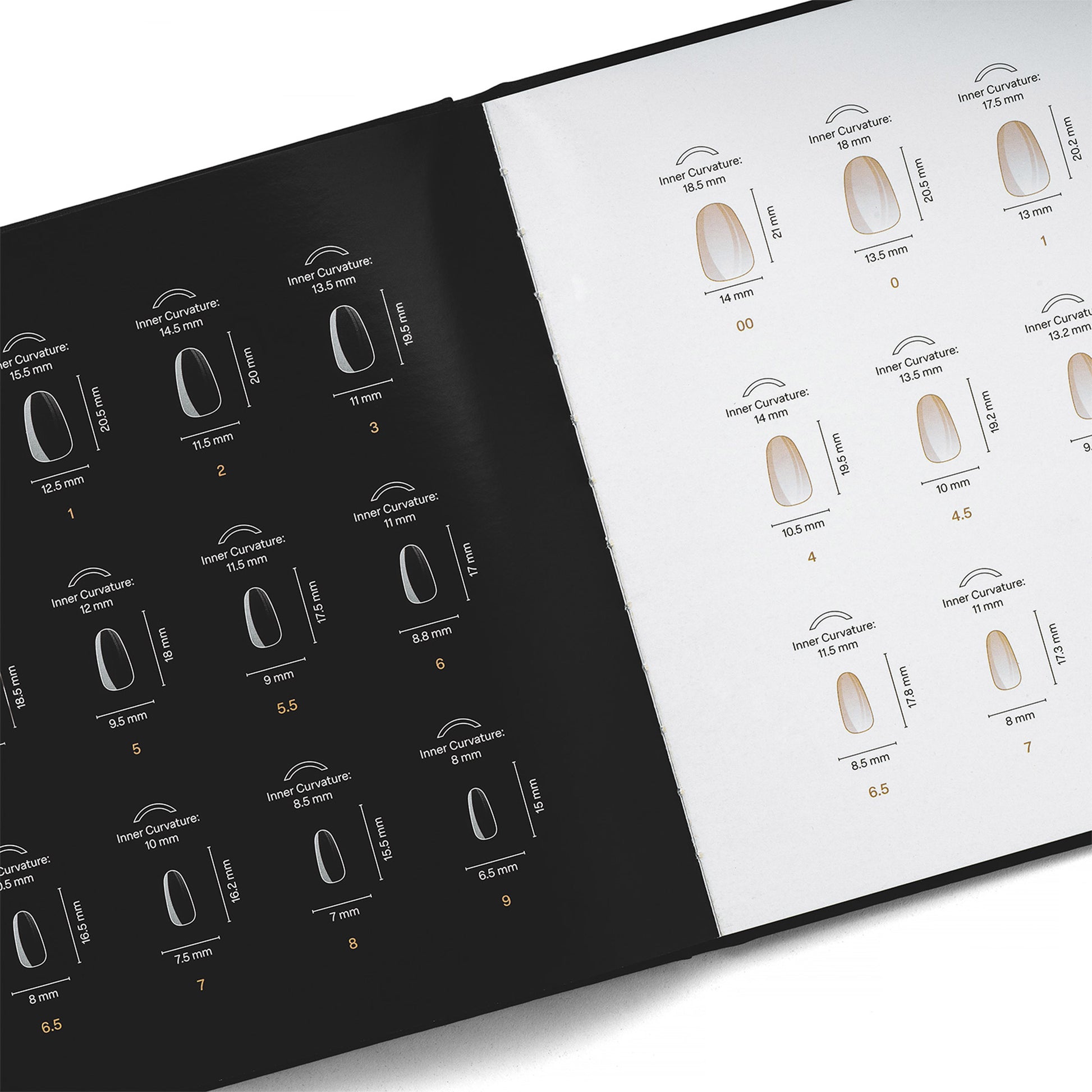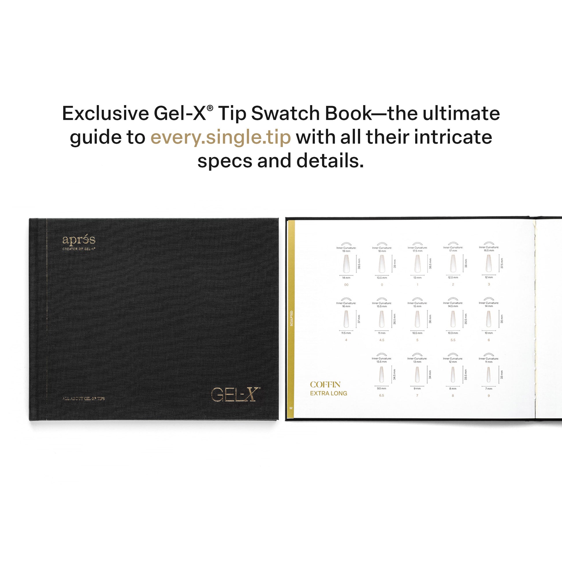 The Gel-X® Tip Book is a lightweight book wrapped in stylish black fabric that shows the exact measurements of every shape and style of tip. Perfect for keeping around your workspace to make quick references and compare styles.