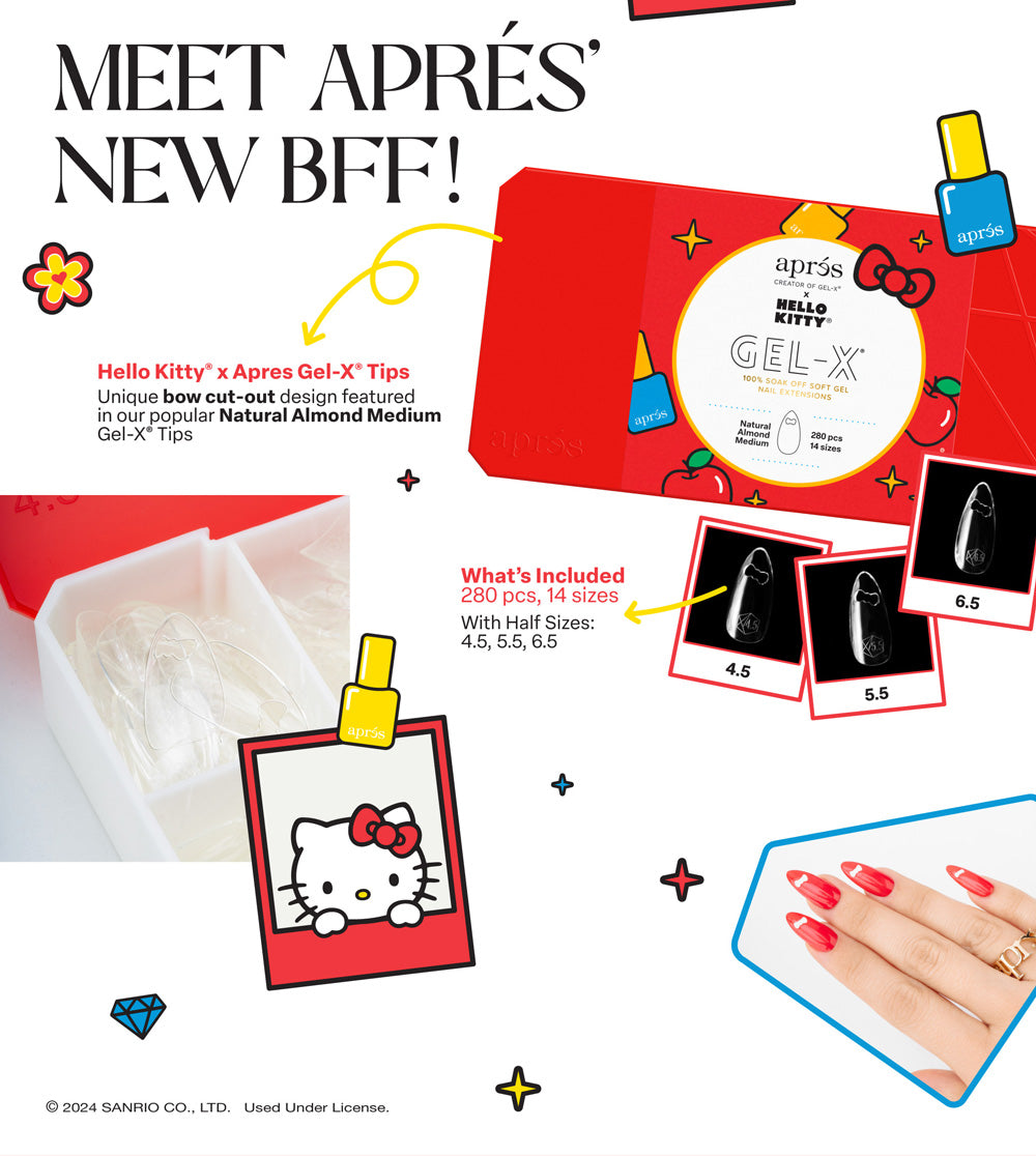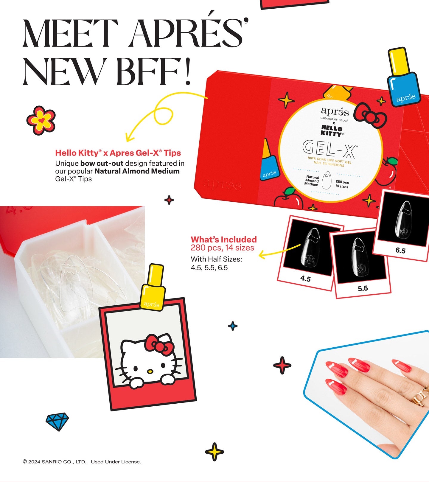 Our exclusive Hello Kitty® x Aprés Gel-X® Tips features Hello Kitty’s signature bow in an eye-catching cut out design. Made from the same patented soft gel formula as our signature Gel-X Tips, each box comes with 280pcs and 14 sizes. These unique Hello Kitty® Gel-X Tips are sure to become your new nail BFF!