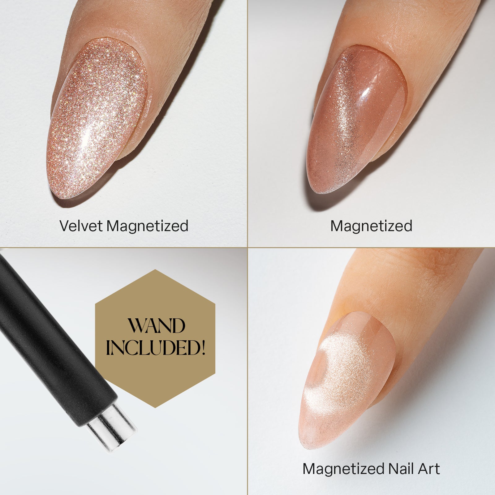 10 Velvet Cat Eye Shades: Every Velvet Cat Eye shade, from an icy bluish white to a luxuriously rich green, leaves a regal and glowing velveteen finish with super-fine magnetic particles suspended in a sheer color gel base to create a completely custom, one-of-a-kind look. Includes Magnet Wand.