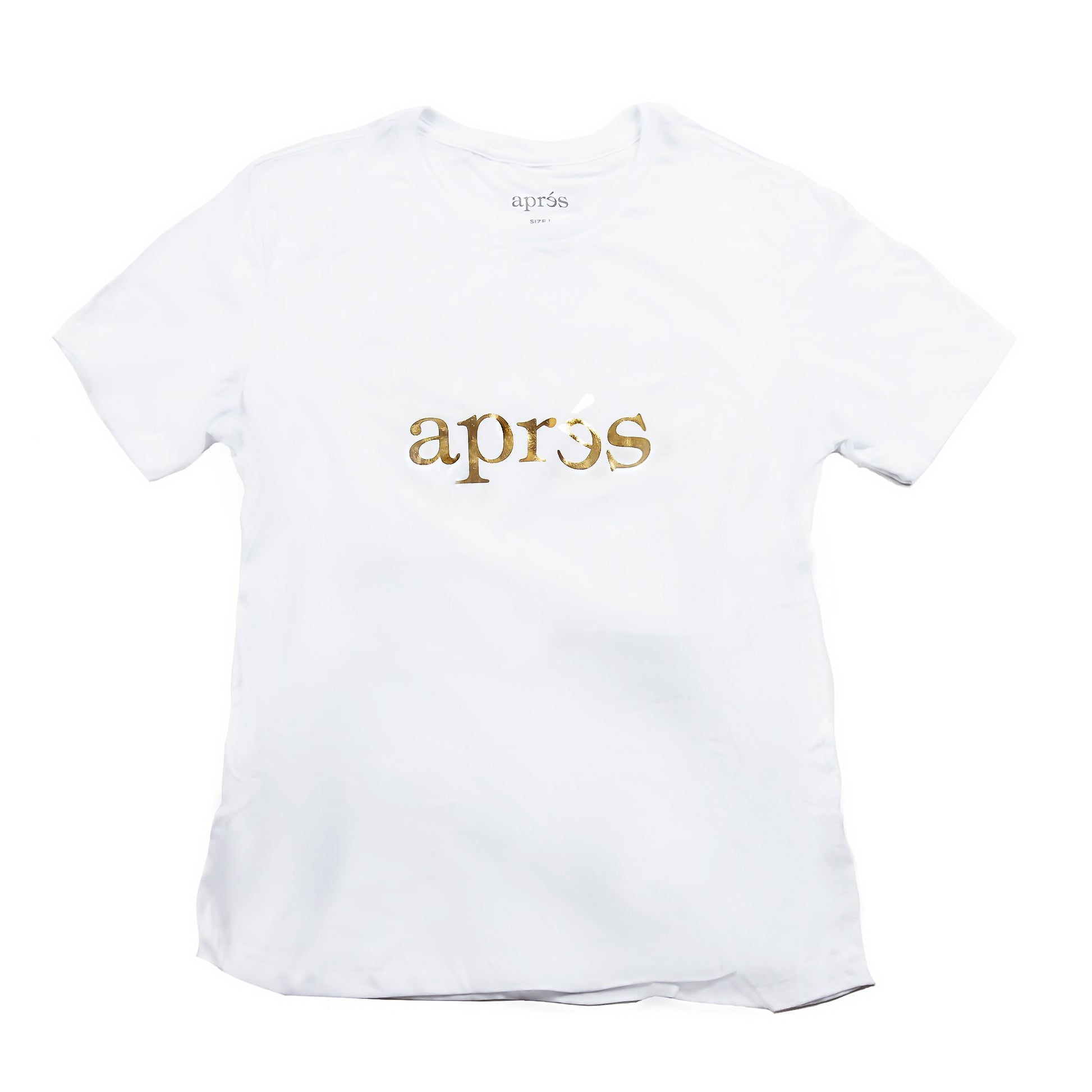 This unisex white and gold shirt is not only soft but also stylishly captures the heart of Aprés with our chic gold logo printed across the chest.