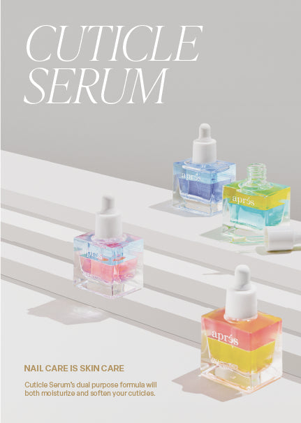 Shake the bottle of Aprés Cuticle Serum to activate the two components. Once thoroughly mixed, apply a drop or two onto each finger and massage into the cuticle.