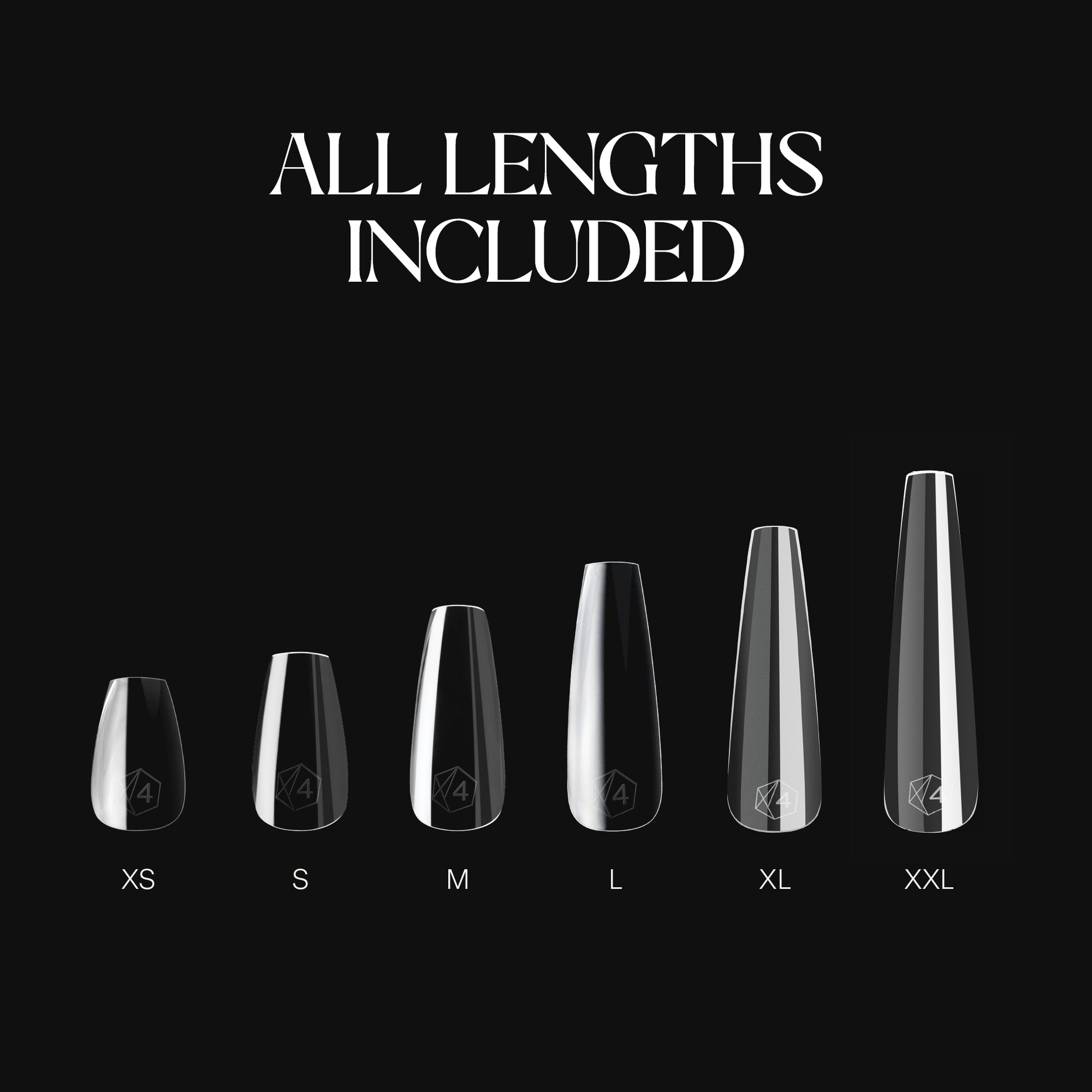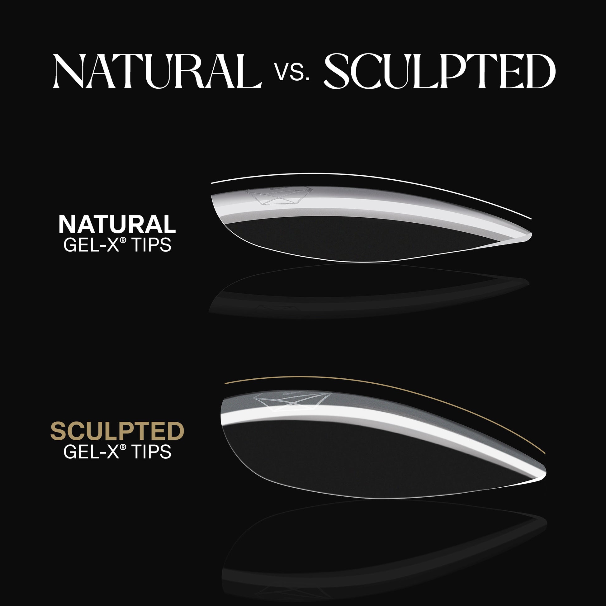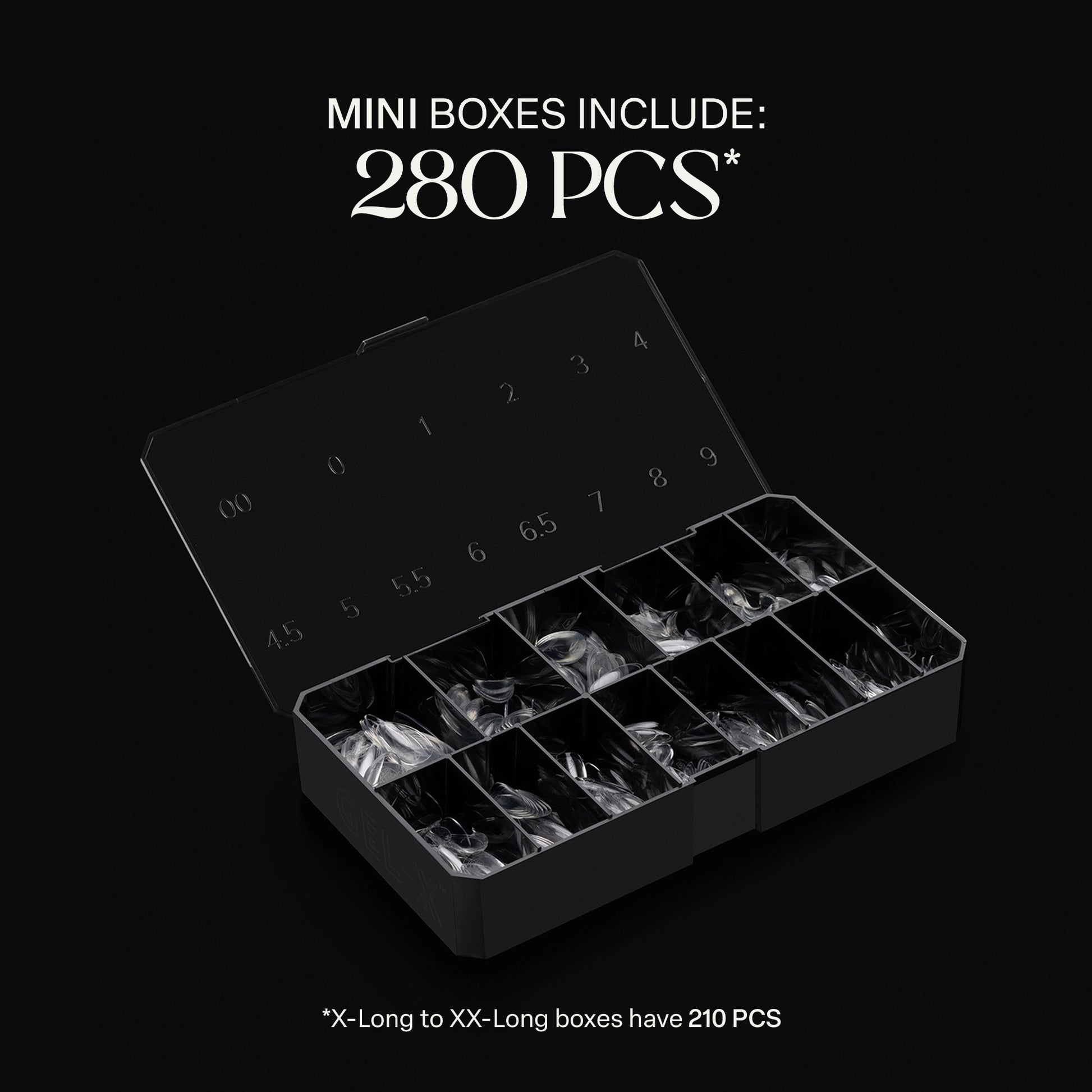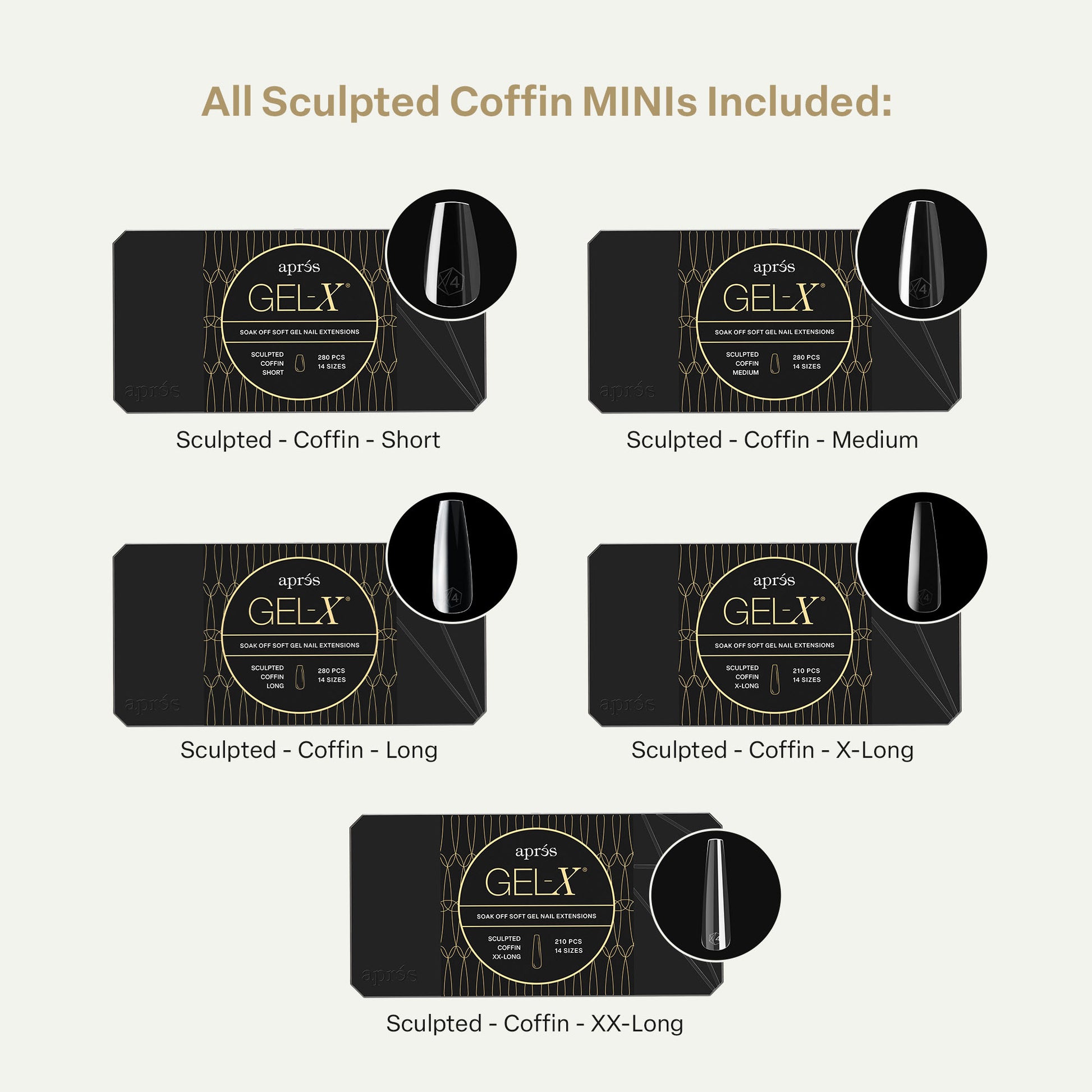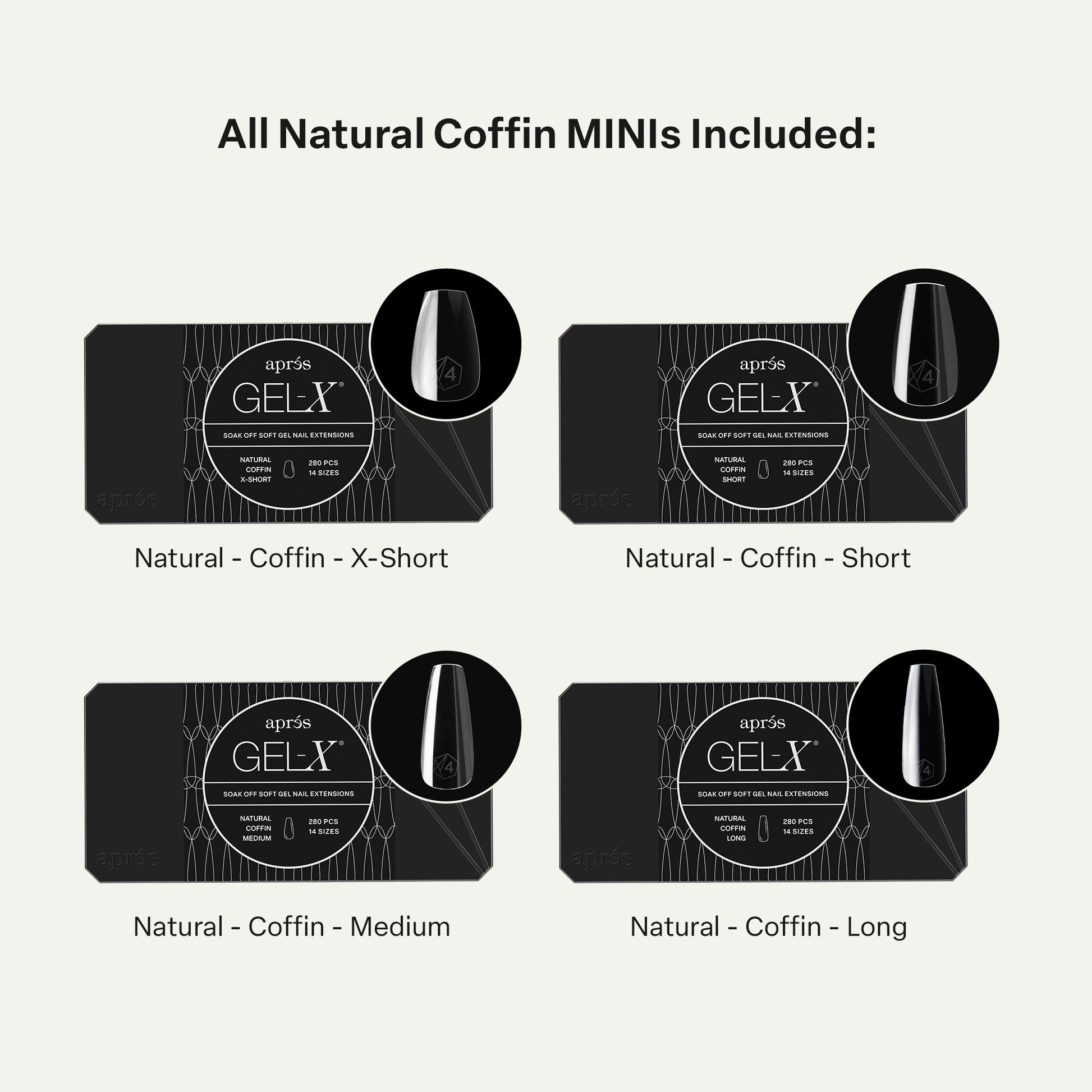 A mini collection of Coffin Gel-X® Tips that includes 8 boxes in every length from Extra Short to Extra Extra Long in a mix of Natural and Sculpted styles. The boxes contain 280 tips (210 tips for the Extra Extra Long length) in 14 sizes including half sizes, so you can find the perfect fit for every nail bed.