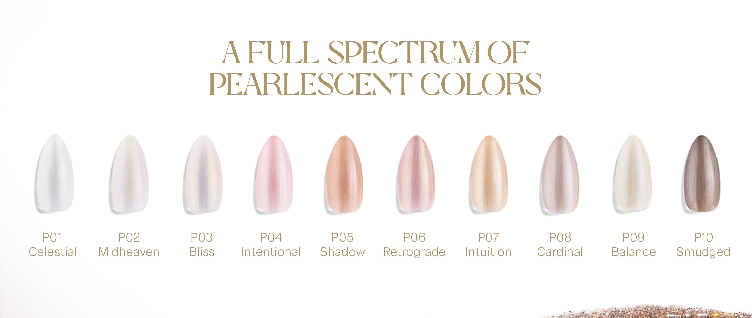 10 Pearlescent Shades: Ranging from iridescent white to toasty taupe, each Pearlescent shade creates an ethereal, iridescent effect with soft, pearl-like multi-dimensional color particles that catch the light from every angle.