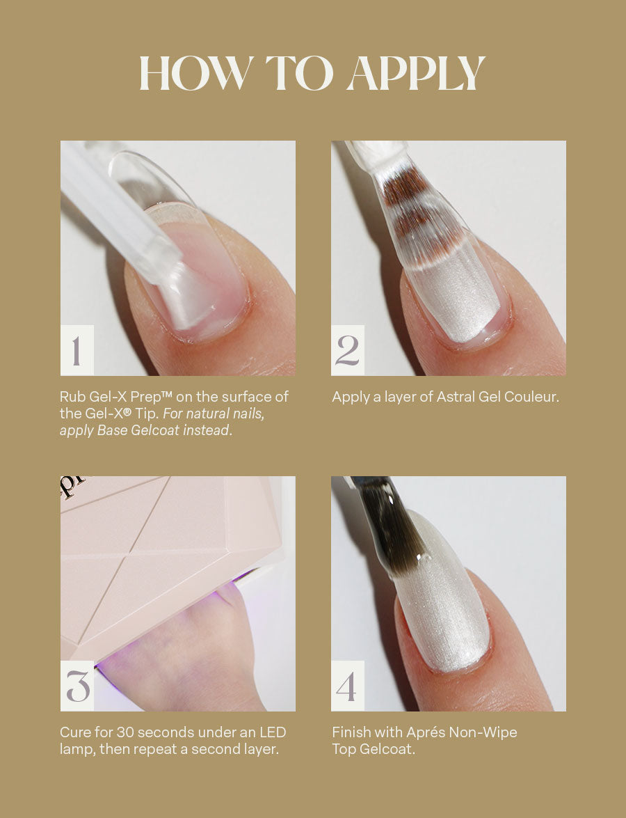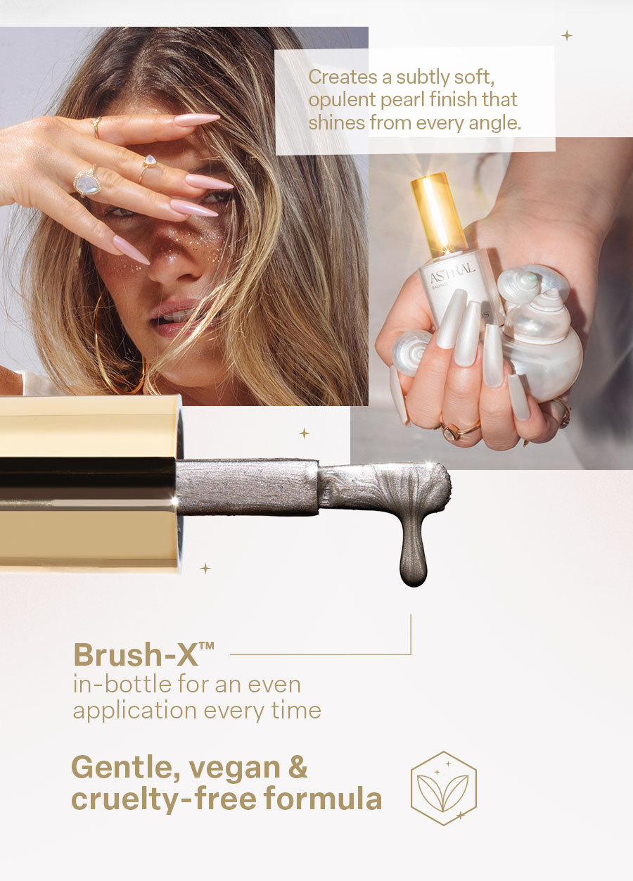 Astral Gel Couleur is a collection of 40 shades in 4 light-refracting, otherworldly finishes - Flash Glitter, Pearlescent, Velvet, and Shimmer Cat Eye. These streak-free, self-leveling formulas leave a unique energetic signature on the nail, empowering you to create looks that resonate on a spiritual level.