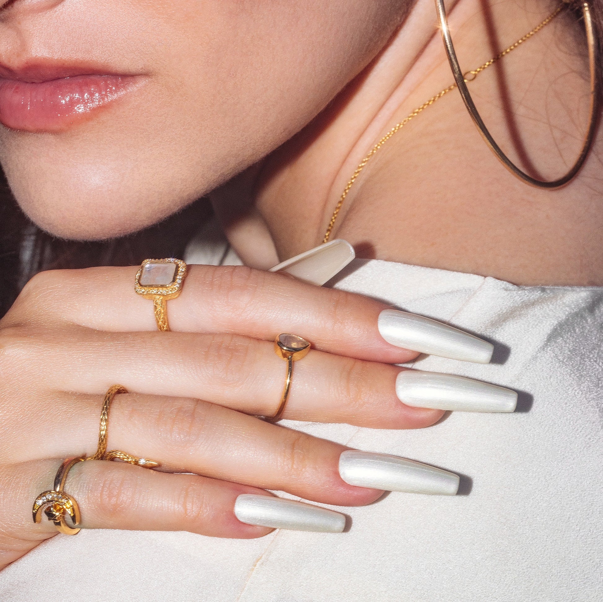 Astral Gel Couleur is a collection of 40 shades in 4 light-refracting, otherworldly finishes—Flash Glitter, Pearlescent, Velvet, and Shimmer Cat Eye. These streak-free, self-leveling formulas leave a unique energetic signature on the nail, empowering you to create looks that resonate on a spiritual level.
