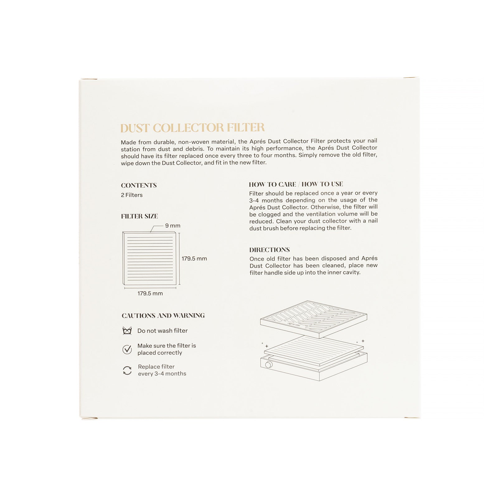 Keep your Aprés Dust Collector 2 running at its optimal capacity with our Dust Collector Filters. Made from durable, non-woven material, the Aprés Dust Collector Filter protects your nail station from dust and debris. To maintain its high performance, the Aprés Dust Collector should have its filter replaced once a year. Simply remove the old filter, wipe down the Dust Collector, and fit in the new filter.