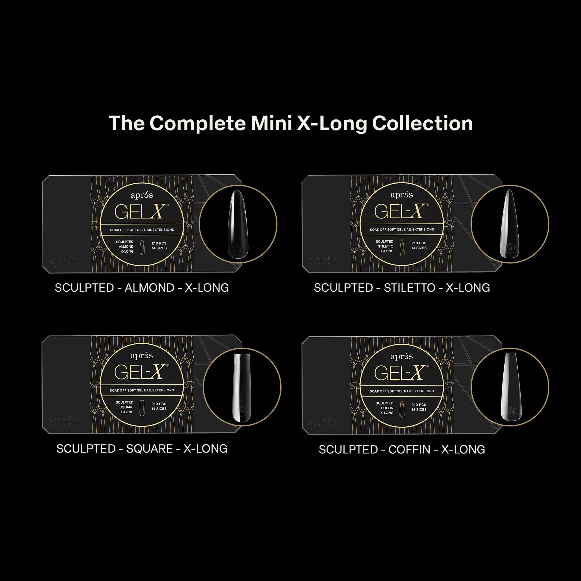 Our Extra Long Mini Collection of Gel-X® Sculpted Tips includes four full-size boxes in Almond, Stiletto, and Square—designed for dramatic length and a sculpted fit that hugs the natural nail bed.