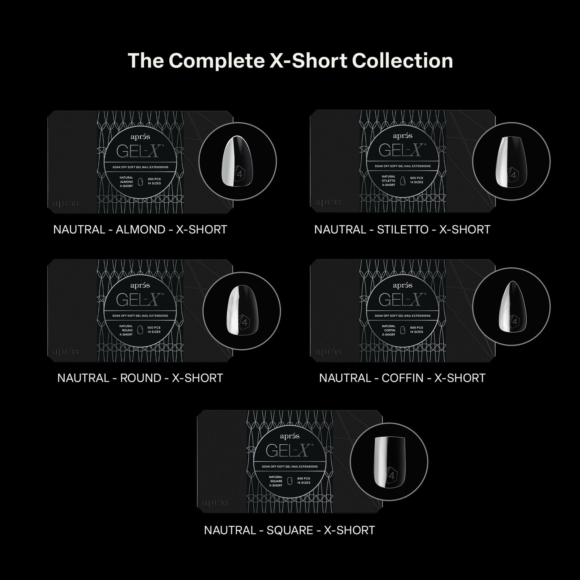 Our Extra Short Pro Collection of Gel-X® Tips includes five full-size boxes of Natural tips in Almond, Coffin, Round Stiletto, and Square. Designed for ultra-wearable length and everyday versatility, this collection keeps you prepared for every client and every nail bed.