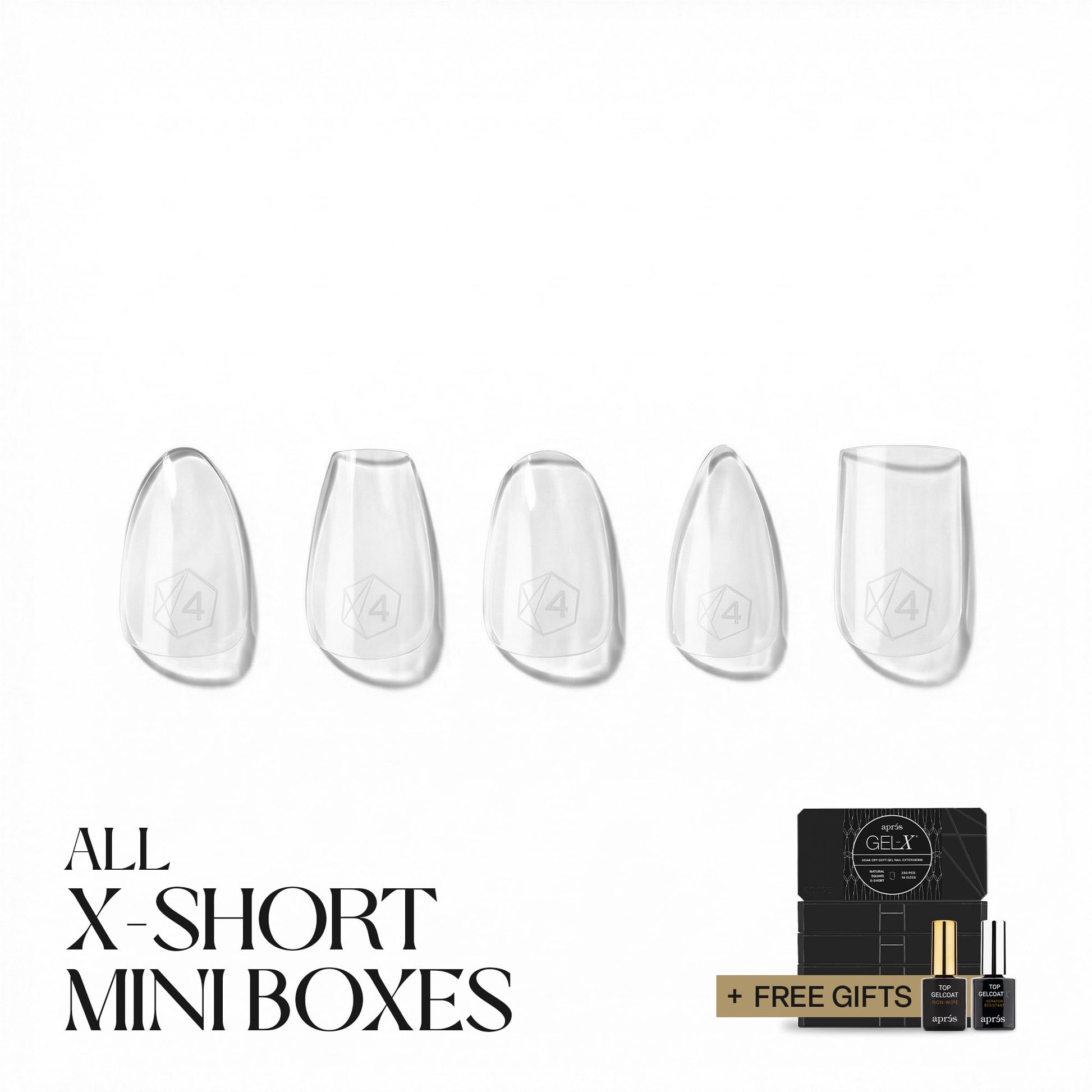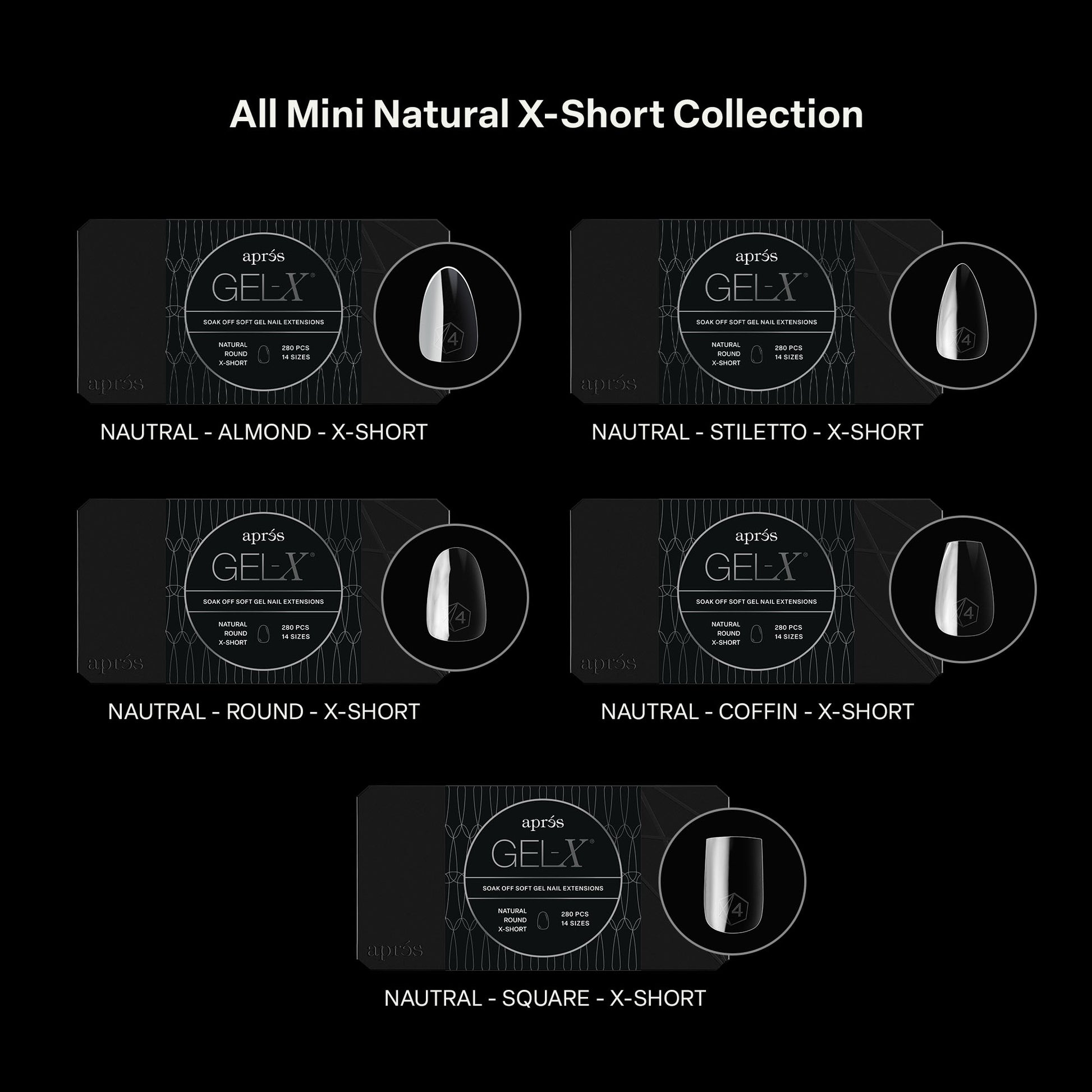 Our Extra Short Collection of Gel-X® Tips includes five full-size boxes of Natural tips in Almond, Coffin, Round Stiletto, and Square. Designed for ultra-wearable length and everyday versatility, this collection keeps you prepared for every client and every nail bed.