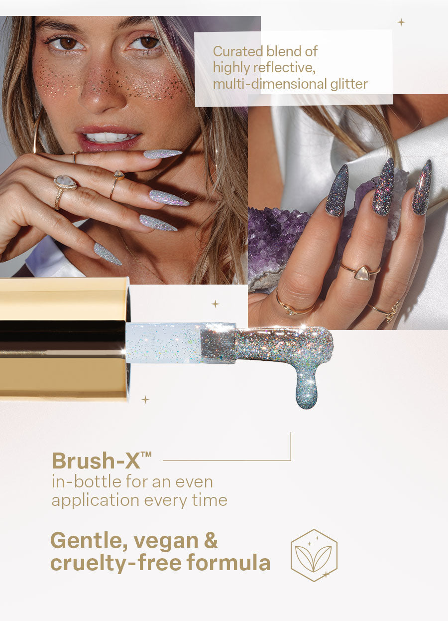Astral Gel Couleur is a collection of 40 shades in 4 light-refracting, otherworldly finishes—Flash Glitter, Pearlescent, Velvet, and Shimmer Cat Eye. These streak-free, self-leveling formulas leave a unique energetic signature on the nail, empowering you to create looks that resonate on a spiritual level.