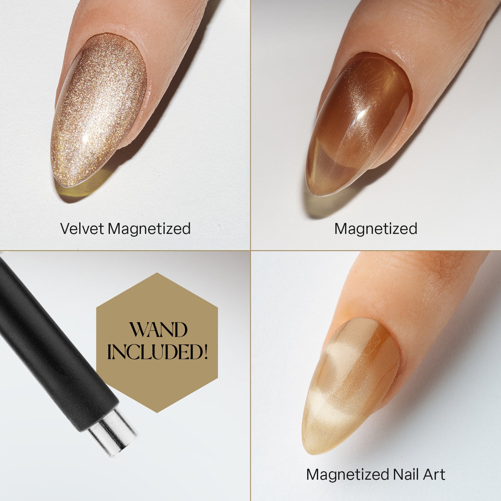 10 Velvet Cat Eye Shades: Every Velvet Cat Eye shade, from an icy bluish white to a luxuriously rich green, leaves a regal and glowing velveteen finish with super-fine magnetic particles suspended in a sheer color gel base to create a completely custom, one-of-a-kind look. Includes Magnet Wand.